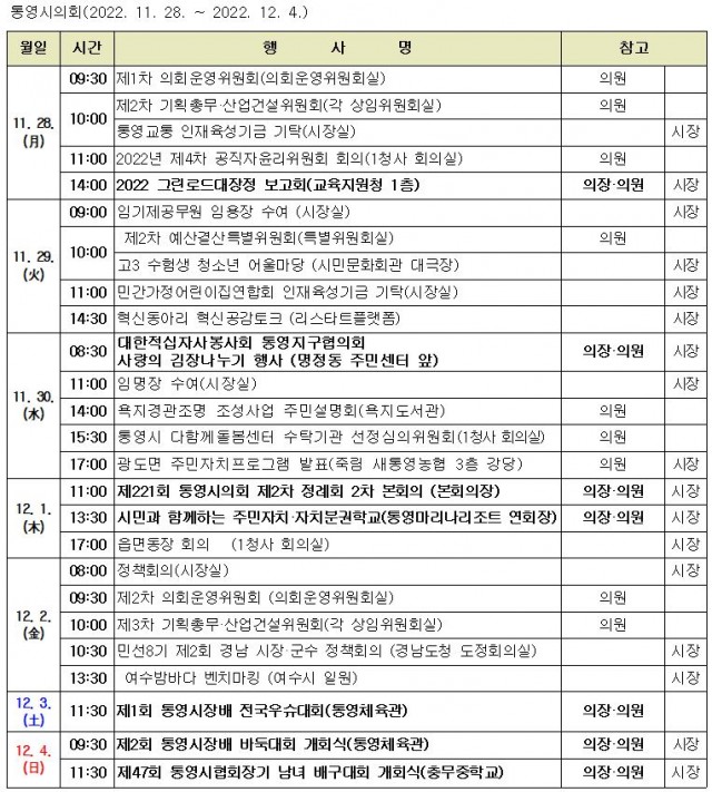 통영시의회 주간행사예정표(2022. 11. 28. ~ 12. 4.)